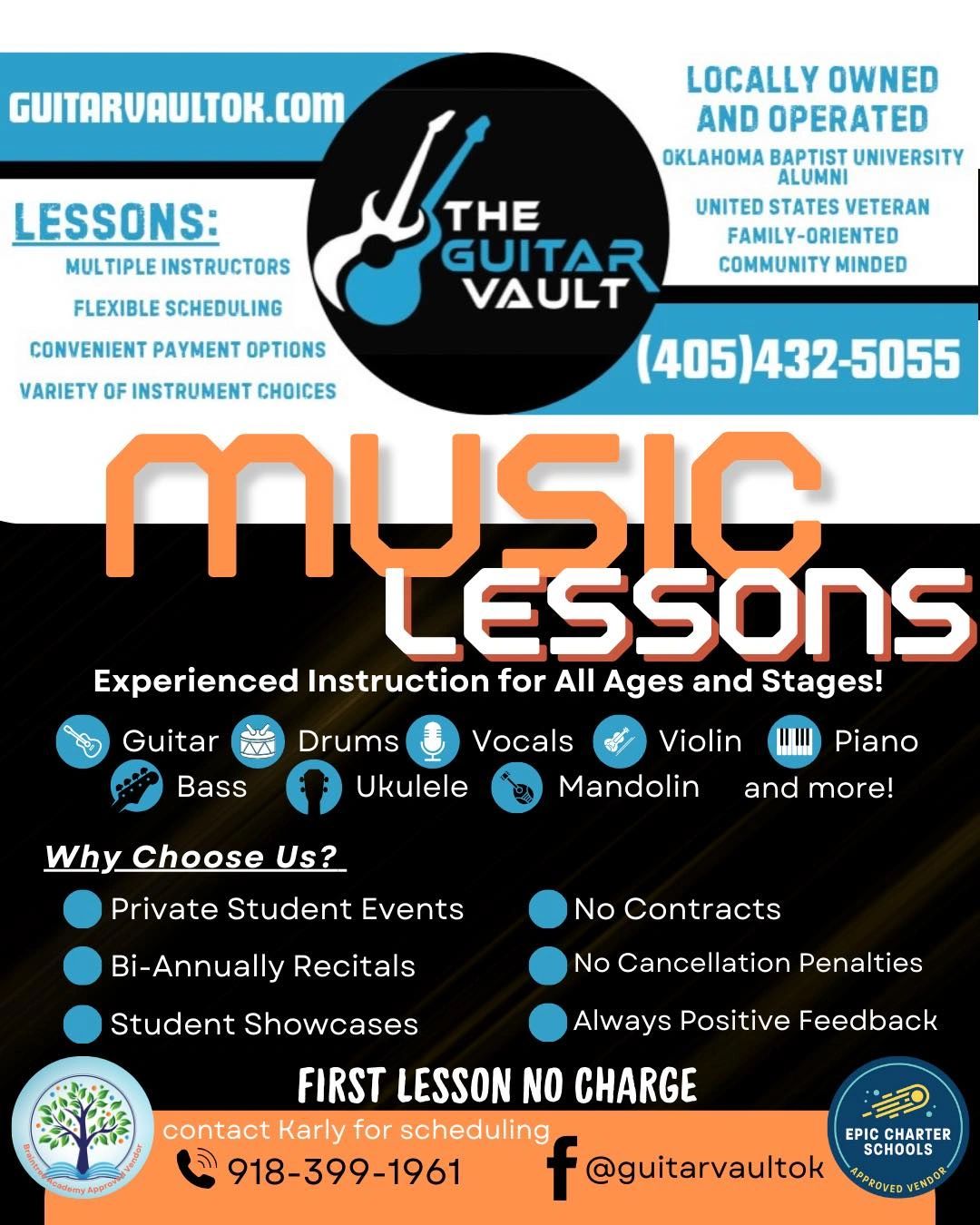 We teach Monday through Saturday from noon to 8pm! Contact Karly at (918) 399-1961 to check on specific openings!
